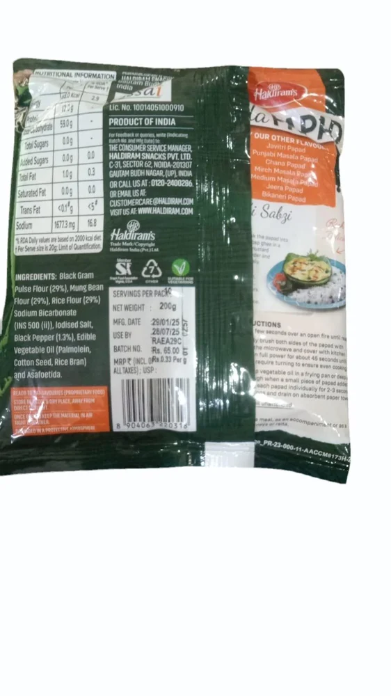 Haldirams Papad Sada is a traditional Indian snack made from high-quality ingredients like lentils and spices, offering a crispy and crunchy texture. It is a simple, yet flavorful papad, typically enjoyed as a side dish or snack. Haldirams Papad Sada can be roasted or fried, and it pairs perfectly with meals like rice and curry, or can be served as a snack with chutneys or pickles. Known for its authentic taste and premium quality, this papad adds a delightful crunch to any meal or can be enjoyed on its own as a tasty treat.
