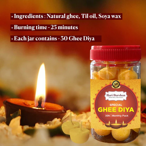 Hari Darshan Special Ghee Diya - 6 Pieces Create a divine and serene atmosphere with Hari Darshan Special Ghee Diya. Crafted with care, these diyas are made to be used with ghee, offering a pure, clean, and long-lasting flame for your religious rituals and ceremonies. The special design ensures an even and bright light, perfect for lighting up your prayers, festivals, and sacred occasions. Key Features: Made for use with ghee, providing a pure and steady flame Ideal for poojas, religious rituals, and festivals Long-lasting and safe to use Beautifully designed for a traditional look Pack of 6, perfect for multiple occasions Enhance your spiritual moments with the soothing light of Hari Darshan Special Ghee Diya, bringing peace and positivity to your home.