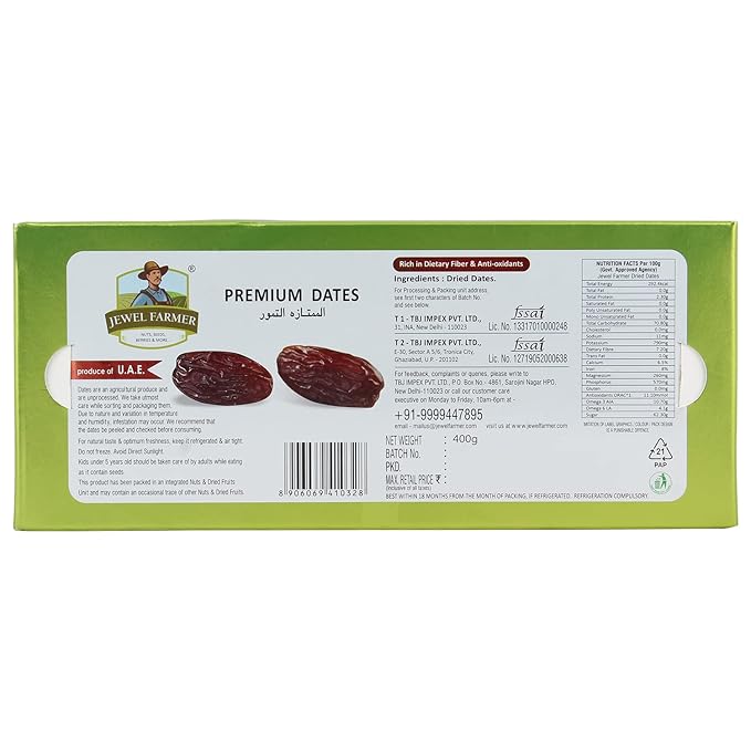 Key Features High-quality, naturally dried Nawab dates Rich in natural sweetness, offering a soft, chewy texture Packed with essential vitamins, minerals, and fiber Free from preservatives, additives, or artificial colors Ideal for a healthy snack, fasting, or energy boost Perfect for adding to desserts, smoothies, or salads Helps support digestion and overall wellness Description Jewel Farmer Dry Dates Nawab are a premium variety of dates, naturally dried to preserve their rich sweetness and chewy texture. Known for their high nutritional value, these dates are packed with essential vitamins, minerals, and fiber, making them an excellent choice for a healthy snack. Free from preservatives and artificial additives, Jewel Farmer Dry Dates Nawab offer a pure, natural treat. They’re perfect for adding a nutritious boost to your diet, whether eaten as a snack, incorporated into desserts, blended into smoothies, or mixed into salads. Ingredients 100% dried Nawab dates. Storage Tips Store in an airtight container in a cool, dry place, away from direct sunlight. To maintain freshness, keep the container tightly sealed. How to Use Enjoy Jewel Farmer Dry Dates Nawab as a standalone snack, or add them to smoothies, desserts, or salads. They’re also great for energy during fasting or as a natural sweetener in recipes.