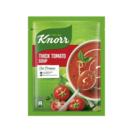 Key FeaturesRich and creamy tomato soup with a smooth texturePacked with the goodness of ripe tomatoes and selected spicesQuick and easy to prepare – just add hot waterNo artificial preservatives or colorsIdeal for a comforting meal or a snackDescriptionKnorr Soup Thick Tomato is the perfect bowl of warmth and comfort, offering a rich, creamy tomato flavor with every spoonful. Made with high-quality tomatoes and a blend of carefully selected spices, this soup delivers a deliciously thick and satisfying taste. Whether it's a chilly evening or you need a quick snack, Knorr Soup Thick Tomato is ready to serve in minutes – a perfect choice for when you're craving something hearty and delicious.IngredientsTomato powder, sugar, salt, corn starch, spices, and seasoning.Storage TipsStore in a cool, dry place. Once prepared, consume immediately or refrigerate and finish within 24 hours.How to UseTo prepare, empty the contents of the packet into a bowl, add 200-250 ml of hot water, and stir well. Microwave or cook on the stovetop until hot, and enjoy a creamy bowl of tomato goodness!