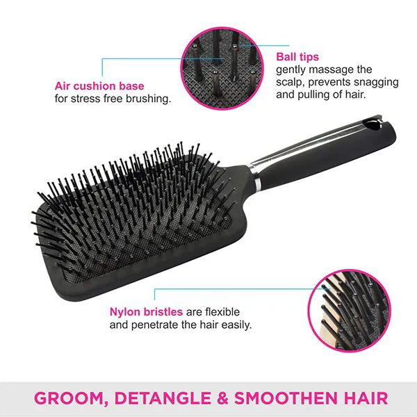 The Vega Paddle Hair Brush E16?PB is a wide paddle brush designed for everyday grooming, detangling, smoothing, and styling of hair of all lengths — from short to long. It features nylon bristles with stay?put ball tips that gently glide through hair to remove tangles and snarls while providing a soothing scalp massage that stimulates circulation and enhances comfort during brushing. The paddle shape helps distribute pressure evenly and smooth the hair surface, adding natural shine and manageability without harsh pull or breakage. This brush is suitable for daily hair care and helps keep hair neat, smooth, and manageable.
